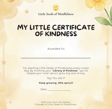Download your "My Little Certificate of Kindness" to celebrate your child’s transition from a little seed to a blooming mindful sprout. Print it out, write their name, and hang it somewhere special to remind them of the kindness they carry inside.