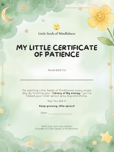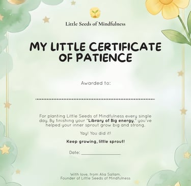 Download your "My Little Certificate of Patience" to celebrate your child’s transition from a little seed to a blooming mindful sprout. Print it out, write their name, and hang it somewhere special to remind them of the patience they carry inside.