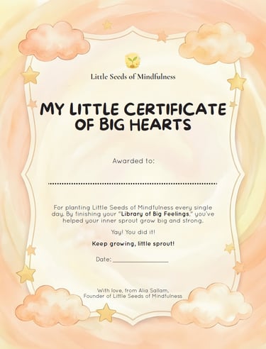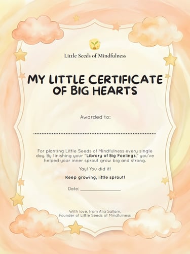 Download your "My Little Certificate of Big Hearts" to celebrate your child’s transition from a little seed to a blooming mindful sprout. Print it out, write their name, and hang it somewhere special to remind them of the love and strength they carry inside.